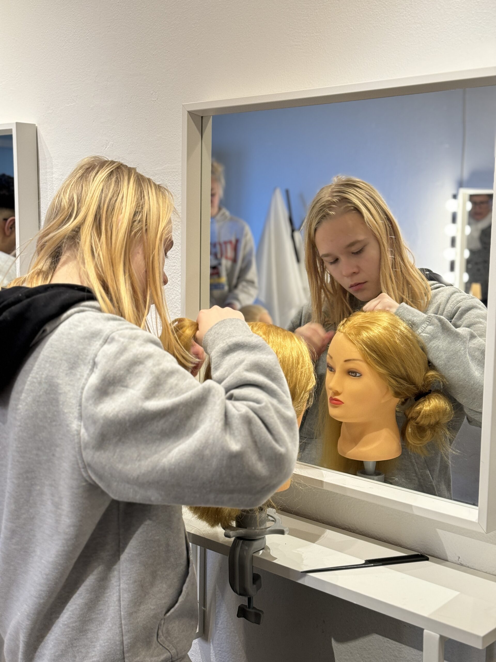 Her arbejder du med hårpleje, frisurer og håropsætning – først på øvehoveder, og senere på hinanden. Du lærer også om hudpleje, makeup og neglepleje. Vi snakker hårmode, stil og hvad frisørfaget kræver.